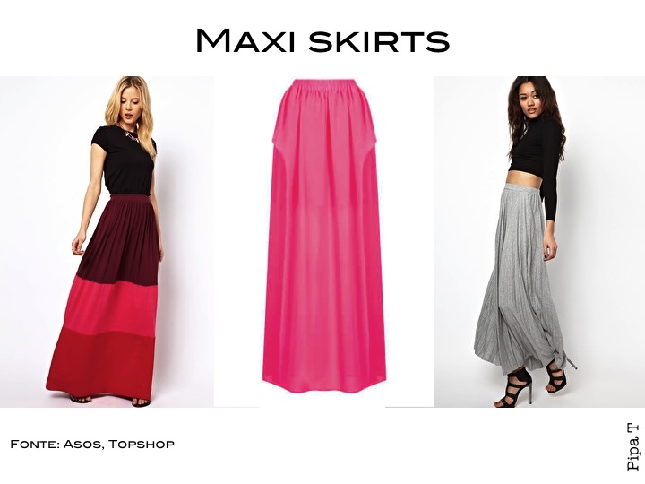 Quase só tenho maxi skirts de verão. Combino-as com um top cai-cai e um colar statement. Se quiser tirar-lhes um pouco o ar hippie ou boho aposto numas sandálias como as da imagem da direita.