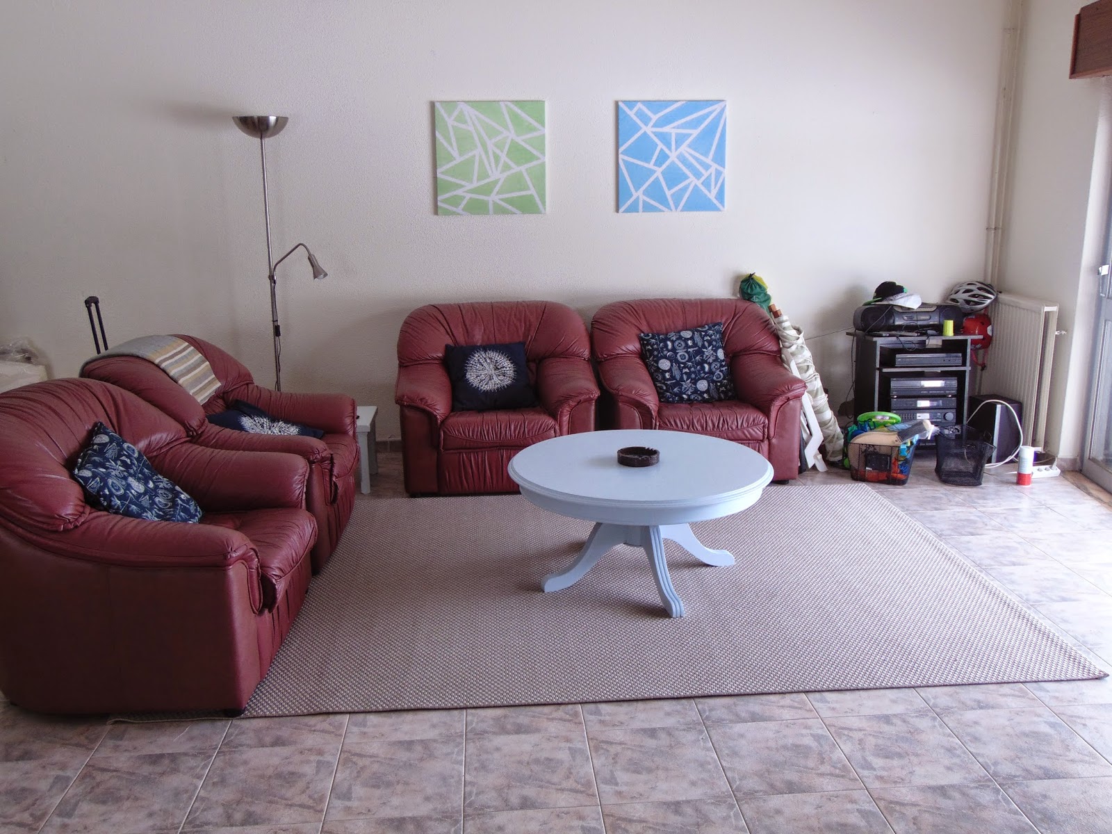 Pintámos cadeiras, mesa de jantar e várias mesas de apoio (nomeadamente a redonda que se vê no meio das poltronas nesta foto).